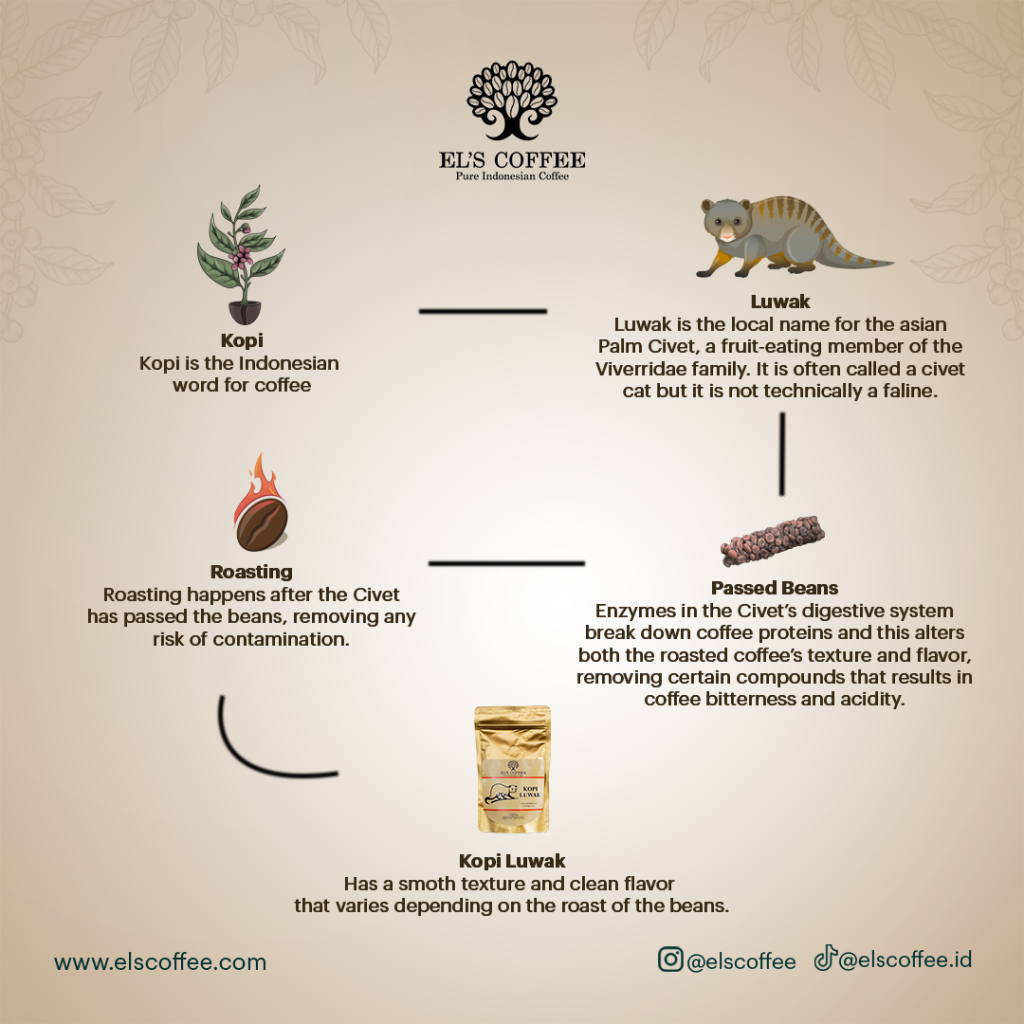 Kopi luwak sendiri merupakan minuman kopi biasa pada umumnya, namun yang membedakan adalah proses pembuatan kopi yang diambil dari biji kopi sisa kotoran hewan yang memakan buah kopi terbaik. Hewan yang dimaksud tentu bernama luwak yakni hewan sejenis musang. Luwak merupakan hewan mamalia dan hewan asli dari Indonesia.
